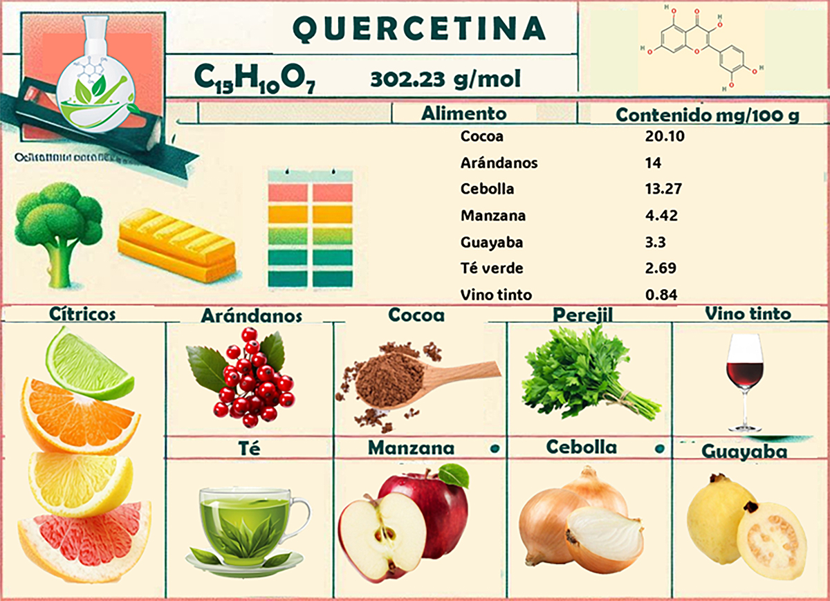 La quercetina puede ejercer estos efectos beneficiosos a través de varios mecanismos, incluyendo la inhibición de enzimas y la modulación de vías de señalización celulares. Sin embargo, es importante destacar que la biodisponibilidad y la eficacia de la quercetina pueden variar dependiendo del origen (fuente natural donde se encuentre) y la forma en que se consume. Entre las fuentes principales de quercetina se encuentran algunos productos alimenticios como el chocolate y el vino, además de algunas frutas como la guayaba, manzana, arándanos y cítricos. Por ejemplo, en el marco de un proyecto colaborativo de investigación sobre el valor agregado de frutos de interés regional en Veracruz, en el laboratorio de Química de Productos Naturales del Instituto de Ecología, A. C. se cuantificó la concentración de quercetina y de dos derivados glucosilados (quercetina-3-D-galactósido y quercetina-3-glucósido) en dos etapas de maduración y en diferentes tejidos de la guayaba. Encontramos que las cantidades más altas de este compuesto se encuentran en la cáscara y que su contenido permanece sin grandes cambios entre la etapa verde y el fruto maduro. El derivado de la quercetina más abundante fue la quercetina-3-D-galactósido, que es la unión entre la quercetina y el azúcar galactosa5. También se participó en un estudio en donde se determinó el contenido de quercetina y de cuatro derivados glucosilados (quercetina-3-D-galactósido, quercetina-3-glucósido, quercetrina y rutina) en tres diferentes cultivares de manzana: Criolla, Golden y Rayada. Además, se consideró en el estudio manzanas que provenían de tres estados productores, los cuales fueron Hidalgo, Nuevo León y Puebla. Interesantemente, encontramos que la mayor cantidad de quercetina se presenta en el cultivar Criolla del estado de Puebla. En la comparación en el contenido de quercetina y sus derivados glucosilados entre cultivares independientemente del estado productor encontramos que las manzanas criollas presentan los contenidos más altos. Coincidentemente, el derivado glucosilado más abundante en las manzanas analizadas fue la quercetina-3-D-galactósido, al igual que en la guayaba6.