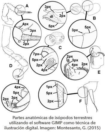 Existe una gran variedad de técnicas que pueden aplicarse a la ilustración científica. La acuarela, el grafito, los lápices de color, las tintas, el gouache, el aerógrafo, etc., son herramientas habituales para ilustraciones con técnicas tradicionales (Figura 3). Las técnicas digitales son igualmente importantes y además complementarias a las tradicionales, sin embargo, las ilustraciones digitales son creadas a partir de softwares como Photoshop, Illustrator o Corel Painter, en los que se trabaja a partir de vectores y pinceles digitales. Otros softwares, como GIMP, permiten dibujos digitales lineales precisos con un procedimiento que utiliza gráficos de mapa de bits, que podrían ayudar al taxónomo a realizar dibujos lineales de alta calidad (Figura 4). También se pueden desarrollar ilustraciones más sencillas a partir de un lenguaje de programación para análisis de datos, en el que se crean imágenes a manera de siluetas de especies que se integran con gráficos estadísticos (Figura 5). La mayoría están disponibles gratuitamente y se usan como recurso para la ilustración científica.