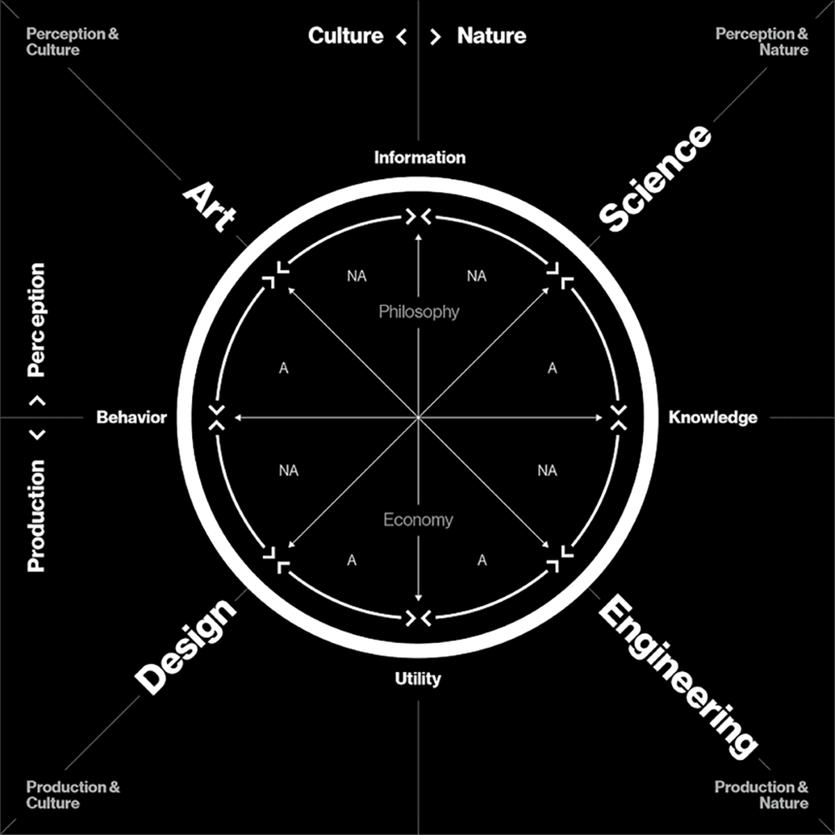 - Comunicación (Diseño): Finalmente, el ciclo culmina en la fase de comunicación, donde el diseño juega un papel crucial. El diseño toma la utilidad creada por la ingeniería y la integra en un contexto cultural, transformando la innovación en comportamiento y estilo de vida. A través del diseño, las invenciones se comunican y adaptan, influyendo en la cultura y retroalimentando el ciclo creativo al cuestionar de nuevo nuestra percepción del mundo.