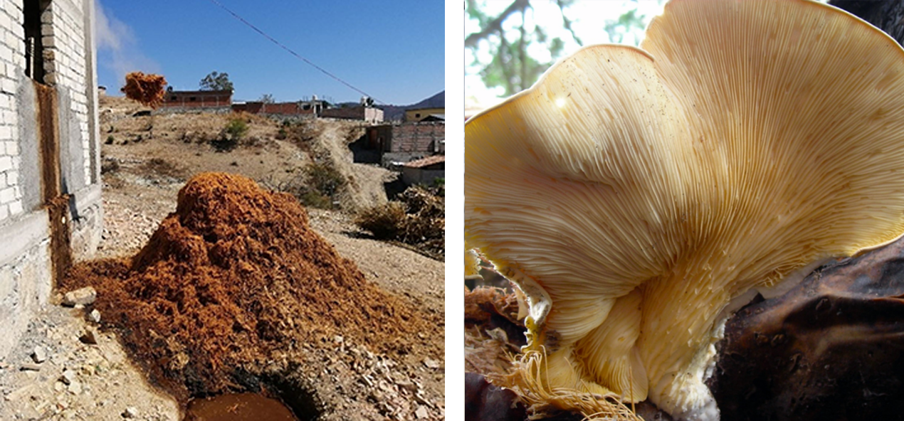 a) Bagazo y vinazas de la producción de mezcal en una fábrica de Oaxaca. b) Ejemplar de Pleurotus agaves creciendo silvestre en una penca de maguey pulquero (Agave salmiana)