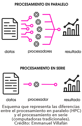 Los sistemas de supercómputo, también conocidos como sistemas de cómputo de alto rendimiento (HPC, del inglés High Performance Computing), son equipos especializados en el procesamiento de datos masivos (big data). A diferencia de las computadoras tradicionales, que realizan la mayoría de sus tareas una tras otra en un mismo procesador (procesamiento en serie), los sistemas HPC están diseñados para ejecutar una misma tarea en dos o más procesadores (procesamiento en paralelo). Gracias a esto, los HPC pueden analizar una gran cantidad de datos en una fracción del tiempo que se requeriría si se procesaran en serie.