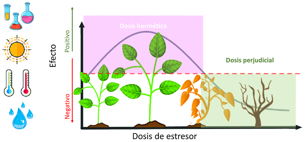 Mediante la inducción mínima de estrés físico o químico es posible generar una respuesta adaptativa en frutos como tomate o mango, que permita alargar la vida postcosecha, así como también, en ciertos casos, incrementar el contenido de compuestos con alto valor nutraceútico. Esto ocurre porque bajo determinadas condiciones, un estrés que usualmente es dañino a altas dosis, a bajas dosis y en cantidades moderadas y controladas induce una respuesta adaptativa o un efecto positivo para la célula o el organismo expuesto, como en nuestro ejemplo inicial, en términos fisiológicos implica una relación dosis-respuesta bifásica. Este fenómeno biológico comprende aspectos a nivel moleculares como el cebado, la activación de los mecanismos de defensa y aclimatación. La hormesis ha sido estudiada en plantas principalmente mediante la aplicación de dosis bajas de herbicidas o metales pesados en cultivos como maíz, algodón, frijol, caña de azúcar, lechuga y tomate y se ha conseguido el incremento en el rendimiento de producción, así como también en otros parámetros, por ejemplo, crecimiento inicial, contenido de azúcares, absorción de fósforo, contenido de cloroplastos o tasa fotosintética. Sin embargo, el uso de este tipo de estresores resulta perjudicial para el medio ambiente, la exposición continua a herbicidas puede dar lugar al surgimiento de plagas resistentes y los metales pesados tienden a acumularse en el suelo.