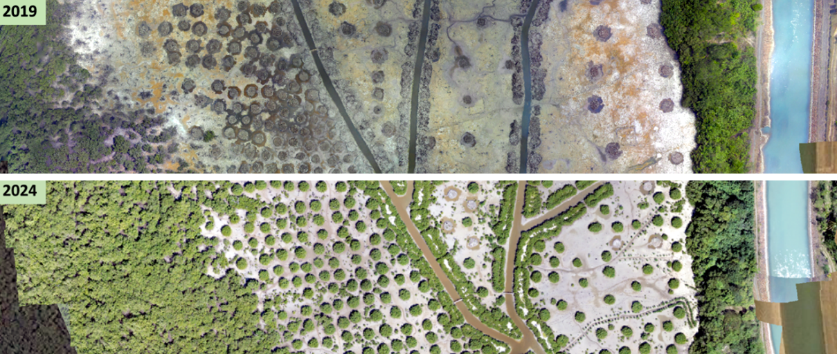 Fig 1: Comparativa del año inicial de las acciones en 2019 con el año actual de 2024 de la efectividad de las acciones de restauración del mangler. Fotografía tomada por: Ángel Francisco Zaragoza Méndez