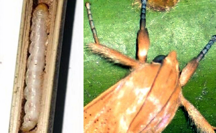 Fig 4. Larva y estado adulto del Lepidóptero (palomilla) barrenador. Foto: J. Pale |