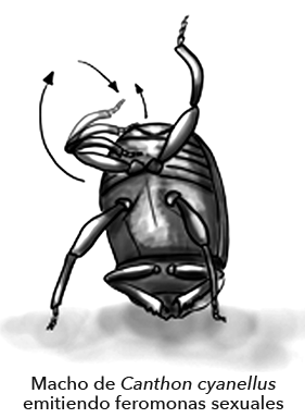 Slider: Macho de Canthon cyanellus emitiendo feromonas sexuales junto a bola de alimento para atraer a una hembra. En Bellés y Favila 1983.