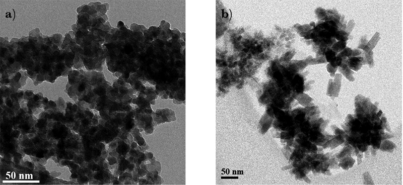 Imágenes obtenidas con microscopio electrónico de transmisión de a) NPs de ZnO y b) ZnO-quitosano (Imágenes: Francisco Paraguay Delgado y Luis A. Hermida Montero)