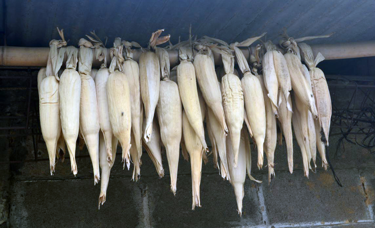 Mazorcas de maíz blanco colgadas para su secado. Foto Carlos Flores