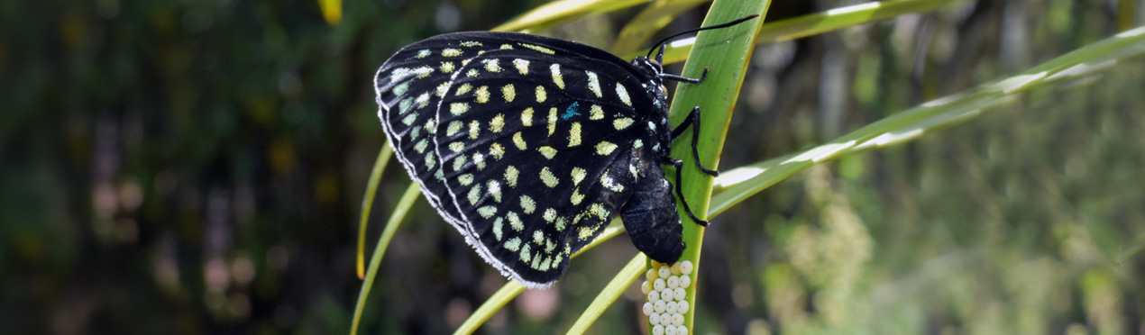 Slider: Mariposa de las cícadas, Eumaeus chidrinae, poniendo sus huevecillos en una hoja de cícada.(créditos: Dalila Callejas)