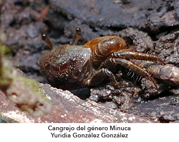 Otro grupo de importancia en la biodiversidad es el de los cangrejos. Hasta el momento hemos identificado nueve especies pertenecientes a siete géneros y cinco familias. El mayor número de especies pertenecen al género Minuca y Leptuca que forman parte de la familia Ocypodidae; registramos también los géneros Aratus y Armases pertenecientes a la familia Sersamidae. También registramos géneros representantes de las familias Portunidae (Callinectes), Gecarcinidae (Cardisoma) y Grapsidea (Goniopsis).