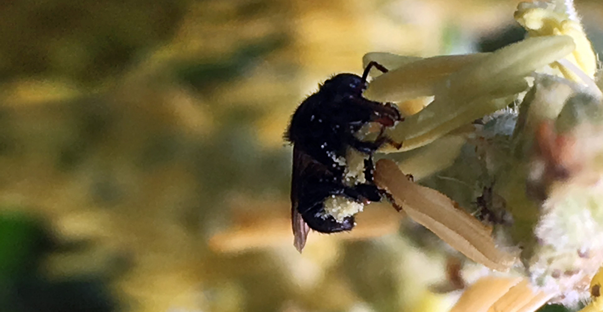 Abeja sin aguijón de la Tribu Meliponini, Scaptotrigona mexicana, conocida como negrita, colmenita o trompetera en la región serrana del totonacapan en Veracruz, donde está ampliamente distribuida y manejada por las comunidades. Es característico su color negro y la forma que construye la entrada de su nido, elementos que ayudan a su identificación.