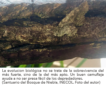 que Darwin llamó "la lucha por la sobrevivencia". Con el paso de las generaciones, estas características adecuadas serán las más comunes en la especie, mientras que las inadecuadas serán raras y posiblemente se lleguen a perder. En este momento debo corregir otra idea popular equivocada, no se trata de la sobrevivencia del más fuerte, sino la del más apto (de hecho podríamos decir "la del menos amolado"). Un individuo más grande y fuerte tal vez se puede defender mejor de un depredador pero corriendo el riesgo de ser lastimado; sin embargo, uno pequeño y ágil puede escaparse, esconderse y así librarse del depredador sin daño. También es importante entender que los organismos viven en condiciones que pueden cambiar con el tiempo; es así, que una característica que en un momento dado es adecuada en otro momento puede ser lo contrario. Un animal con poco pelo puede tener problemas para regular su temperatura en un ambiente frio y por lo tanto ser menos adecuado que uno con mucho pelo; pero, con el advenimiento del cambio climático y la subida considerable de la temperatura los descendientes de pelo escaso ahora tendrán la ventaja sobre los de mucho pelo.
