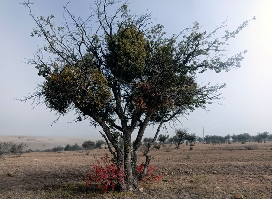 Phoradendron sp. parasitando un individuo de Quercus sp., en el norte de México. Imagen: Guadalupe Amancio