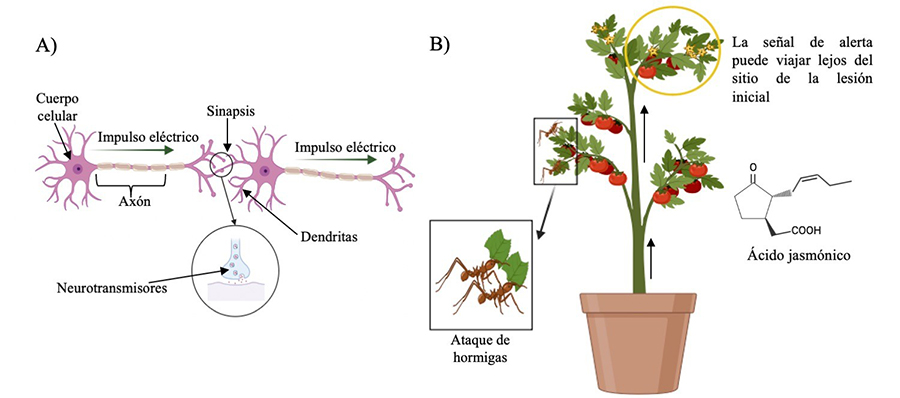 Fig 1. A) Esquema de las neuronas. El sitio donde se unen dos neuronas es conocido como sinapsis y es aquí donde el impulso eléctrico proveniente del cuerpo celular de la primera neurona activa la secreción de sustancias químicas conocidas como neurotransmisores, que ayudan a que el impulso continúe a la siguiente neurona. B) Las plantas al ser atacadas por insectos (ej. Hormigas), activan la síntesis de jasmonatos (ej. Ácido jasmónico), tanto en el sitio del ataque como en lugares distantes (círculo amarillo) a los cuales llegan los mensajes de alerta a través de impulsos eléctricos. Imagen: Nidia Sánchez