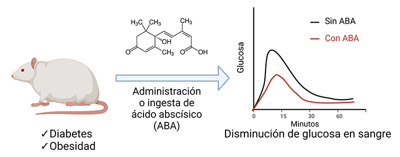 El ácido abscísico (ABA), disminuye los niveles de glucosa en sangre. En modelos animales de diabetes u obesidad, la administración o alimentación suplementada con ABA, produjo una disminución de la glucosa medida en sangre. (Creado con BioRender.com por la MC. Mónica Muñoz-Contreras).