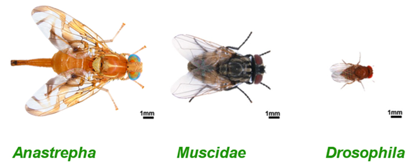 Comparación entre una verdadera Mosca de la Fruta (Tephritidae) del género Anastrepha (extremo izquierdo), una Mosca Casera (Muscidae) (centro) y una Mosca del Vinagre (Drosophilidae) (extremo derecho). Noten lo hermosas que son las verdaderas Moscas de la Fruta, pero esa belleza se desvanece porque son terribles plagas. Fotos: Eric Enciso-Ortiz