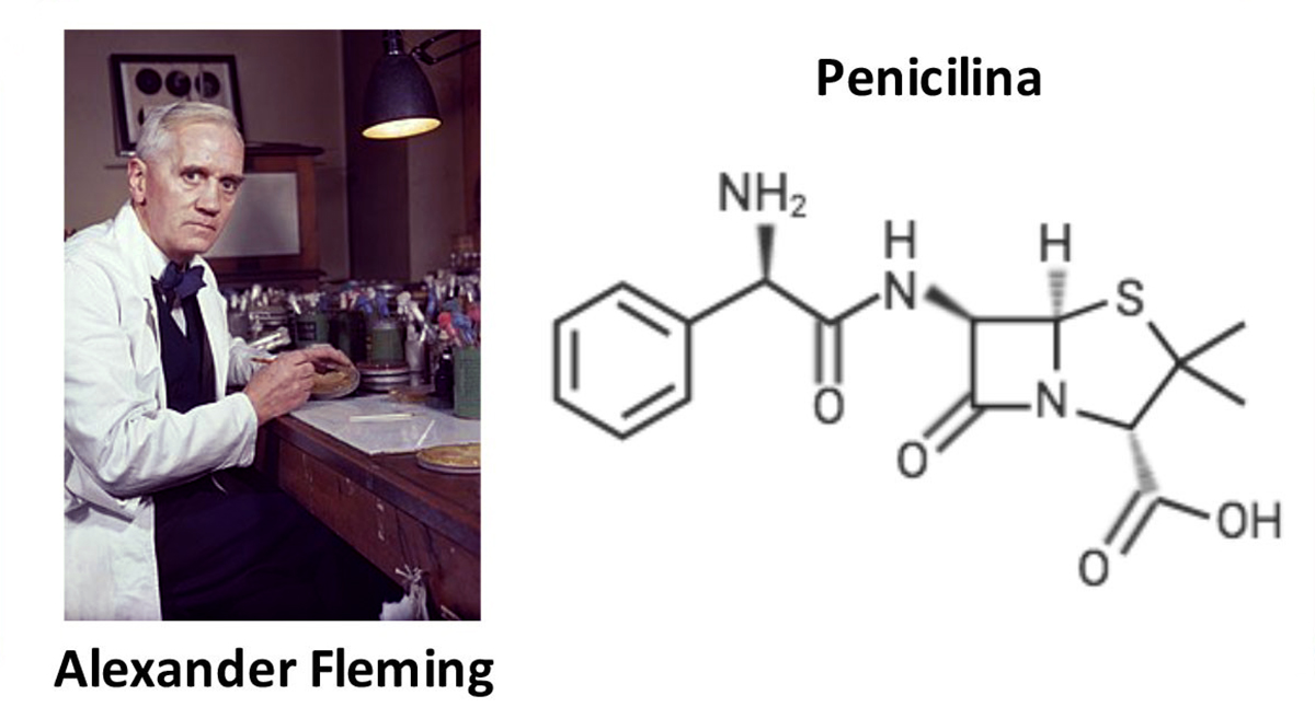Alexander Fleming (descubridor del la penicilina, primer antibiótico) en el laboratorio y estructura química de la penicilina