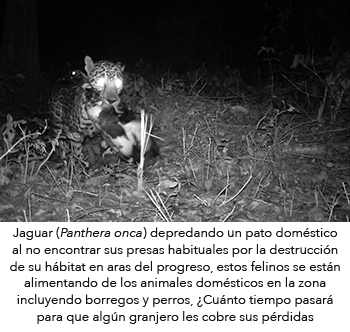 ¿Entonces que está sucediendo con el jaguar (el depredador más grande de Latinoamérica y un ícono de las culturas indígenas considerado como un mensajero de los Dioses con su fuerza y poder, es una especie que está en riesgo de extinción), por ejemplo, en Quintana Roo, con la apertura de grandes extensiones de selvas para la construcción del Tren Maya? Pues ya, antes de que concluya esta magna obra, se están presentando conflictos entre este felino y las comunidades humanas ya que por la destrucción de su hábitat estos animales deambulan erráticamente en busca de alimento y sitios de descanso y están comiendo sus animales domésticos como borregos, gallinas, patos, incluso sus perros, ya que sus presas naturales también están siendo afectadas por esta destrucción, y por esa razón los pobladores ya quieren eliminarlos, y sin duda lo harán. Con lo que estaremos perdiendo parte de nuestra valiosa herencia biológica y cultural.