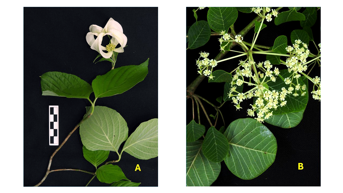 Fig 1. A. Rama con inflorescencia de Cornus florida var. urbiniana (Rose) Wangerin [Xochilcorona]. B. Rama con inflorescencias de Euphorbia schlechtendalii Boiss. [Matagallina]