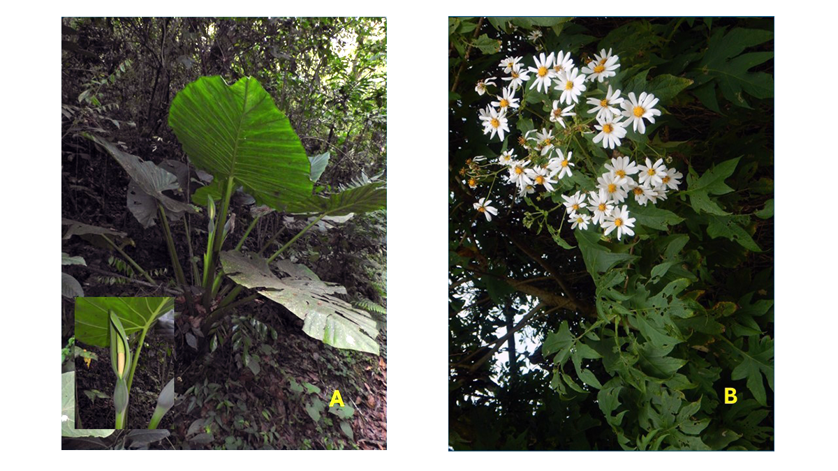 Fig 2. A. Vista de Xanthosoma robustum Schott [Mafafa], detalle de inflorescencia, abajo a la izquierda. B. Inflorescencias de Montanoa grandiflora DC. [Rosa blanca, teresita o zopacle]