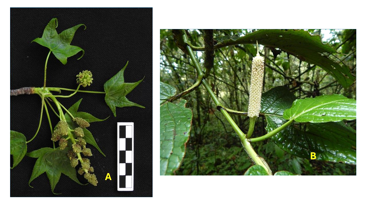 Figura 3. A. Rama con inflorescencias, femenina (la globosa) y masculina (las espigas en racimo), de Liquidambar styraciflua L. [liquidámbar u ocozote]. B. Inflorescencia de Piper lapathifolium (Kunth) Steud. [nombre común desconocido]