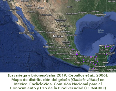 El grisón es un carnívoro mustélido con una amplia distribución en todo el continente americano, desde México, hasta el sur de Brasil y el norte de Argentina. Sin embargo, debido a sus bajas abundancias poblacionales y hábitos esquivos, se trata también de una de las especies de mesocarnívoros menos estudiadas, y de la cual se desconoce mucha información sobre su distribución, ecología y, principalmente, su estado de conservación actual.