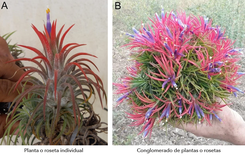Tillandsia ionantha, conocida comúnmente como “gallito rosado” es una especie de notable interés ornamental en horticultura, se encuentra ampliamente distribuida en colecciones privadas y jardines botánicos alrededor del mundo. Es una planta, de naturaleza epífita, es decir, crece sobre los troncos y ramas de los árboles. Aunque es una de las especies más pequeñas dentro de la familia de las bromelias en México, alcanzando apenas 10 cm de longitud en estado adulto (Figura 1A); su atractivo radica en su capacidad para formar grandes rosetas o conglomerados de color rosado y violeta, conformados cada uno de muchos individuos (Figura 1B), lo que la convierte en una candidata especialmente cautivadora para su cultivo. Las hojas del gallito rosado son de tonalidad verde o grisácea, recubiertas por escamas plateadas que adquieren tonalidades rojizas y rosadas antes y durante la floración. Las flores presentan pétalos de un color violeta intenso muy llamativo, con estambres y estigmas que se destacan por su tono color amarillo intenso (Figura 1) (Ehlers, 2000).