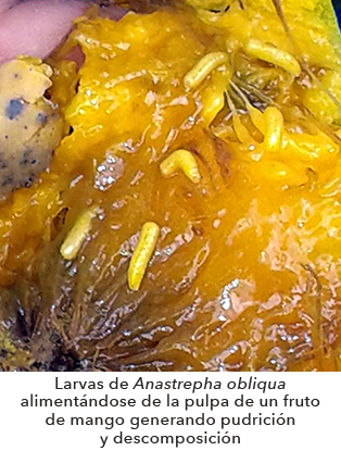 Anastrepha obliqua, es una mosca de la fruta de la familia Tephritidaeconocida como la Mosca de las Indias Occidentales y popularmente como Mosca del Mango por atacar a estos deliciosos frutos. Es considerada una plaga del mango y de la ciruela tropical (conocida comúnmente como jobo o jocote) porque las hembras “entierran” (“ovipositan” técnicamente hablando) sus huevos en el interior de los frutos, los cuales, después de un periodo de incubación aproximado de cinco días, se convierten en diminutas larvas que devoran la pulpa del fruto mientras se desarrollan. Una vez que alcanzan su crecimiento máximo (7.5 - 9 mm de longitud), estas larvas abandonan el fruto para enterrarse en el suelo y así continuar su ciclo biológico. Debido a que los frutos agusanados no se pueden vender o consumir porque la pulpa se pudre/descompone (Figura 1), los productores de frutos frescos consideran a esta plaga muy dañina y la combaten frecuentemente aplicando insecticidas que son nocivos a la salud humana y a la naturaleza. Con el fin de aportar a la solución de este problema, nosotros hemos dedicado gran parte de nuestras carreras como científicos a estudiar a detalle la ecología y el comportamiento de estas moscas plaga para encontrar mecanismos amigables al ambiente o biorracionales para manejarlas/controlarlas.