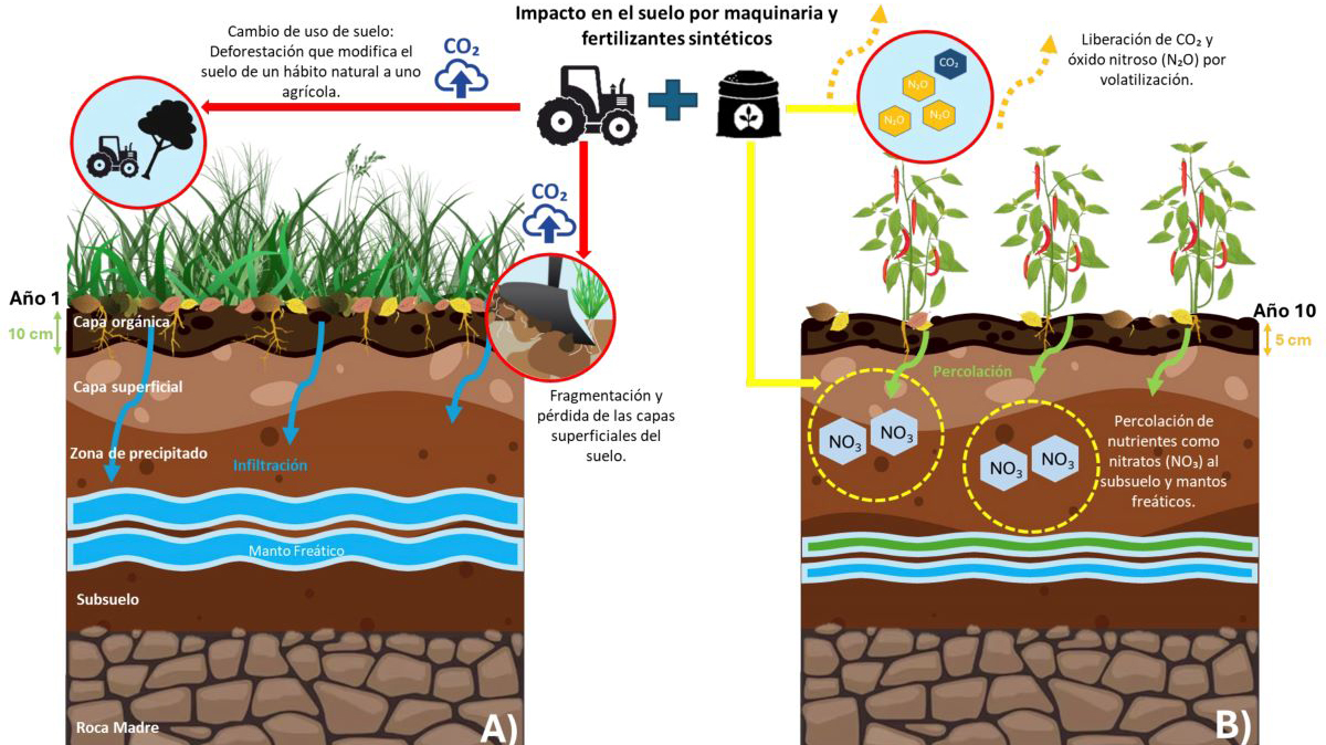 Fig. 1 Impactos de la labranza y la fertilización sintética. A) Deforestación y cambio de uso de suelo de un hábito natural a uno agrícola. B) Después de 10 años de uso de suelo agrícola se da la reducción de materia orgánica y capas superficiales, pérdida de fauna del suelo, compactación, reducción de infiltración de agua, contaminación de mantos freáticos, emisiones de gases de efecto invernadero. Crédito: Autores