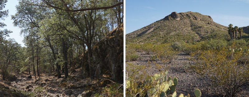 A una distancia aproximada de 500 km una de otra, tanto Mapimí como La Michilía, se ubican al noroeste de México en Durango, una región que resguarda diversos ecosistemas, desde matorrales y pastizales, hasta selvas secas y bosques templados. En esta área, se encuentran zonas de relevancia para la biodiversidad mexicana, como lo son el extenso Desierto Chihuahuense y la majestuosa Sierra Madre Occidental, mismos que han pasado a integrarse al imaginario colectivo que viene a nuestra mente al pensar en México, y que a su vez representan fielmente dos paisajes muy distintos (Fig. 1).