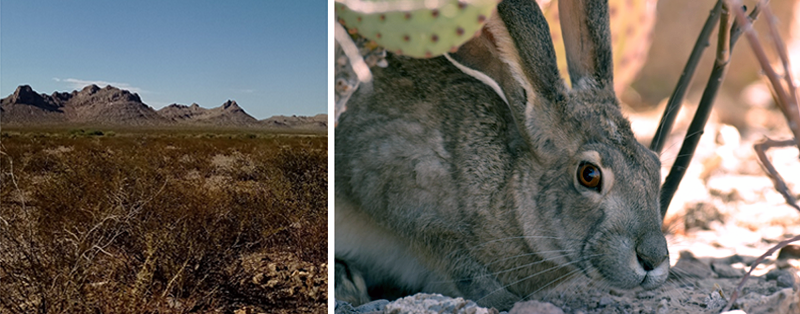 Matorrales de Mapimí, hábitat de liebre cola negra (Lepus californicus). Foto: piasaje, ASC y liebre cola negra JRL.