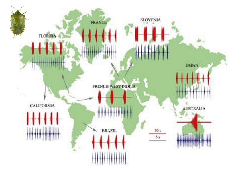 Diferencias en las estridulaciones de varias poblaciones de la chinche Nezara viridula, hembras en rojo y manchos en azul