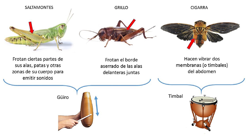 Estridulación de tres insectos y el instrumento musical con el que se relacionan (Elaboración propia)